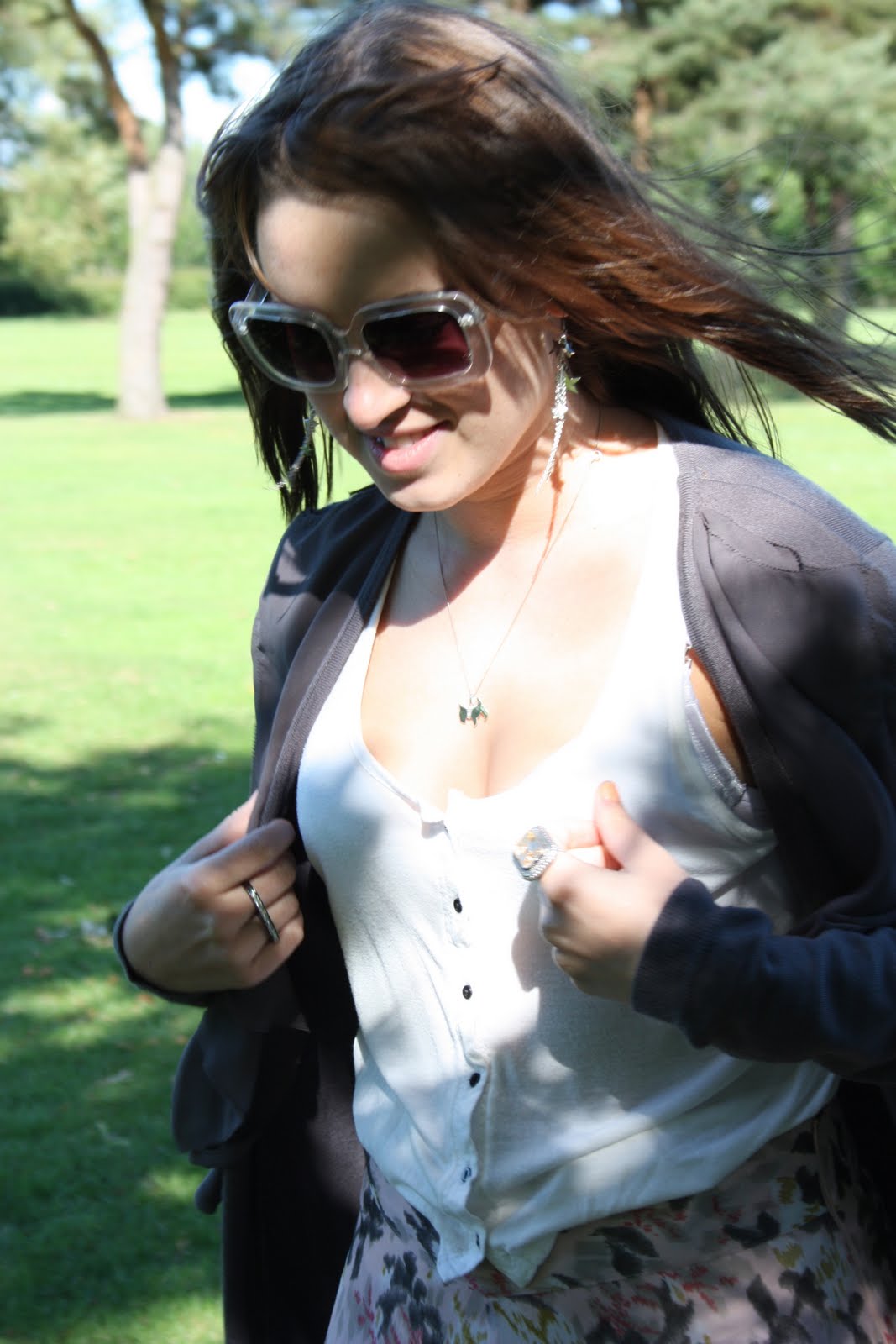 Cardigan; Jesire, Vest; Topshop, Trousers; New Look, Shoes; Primark, Bag; Fiorelli, Sunglasses; H&M, Jewellery; Vintage